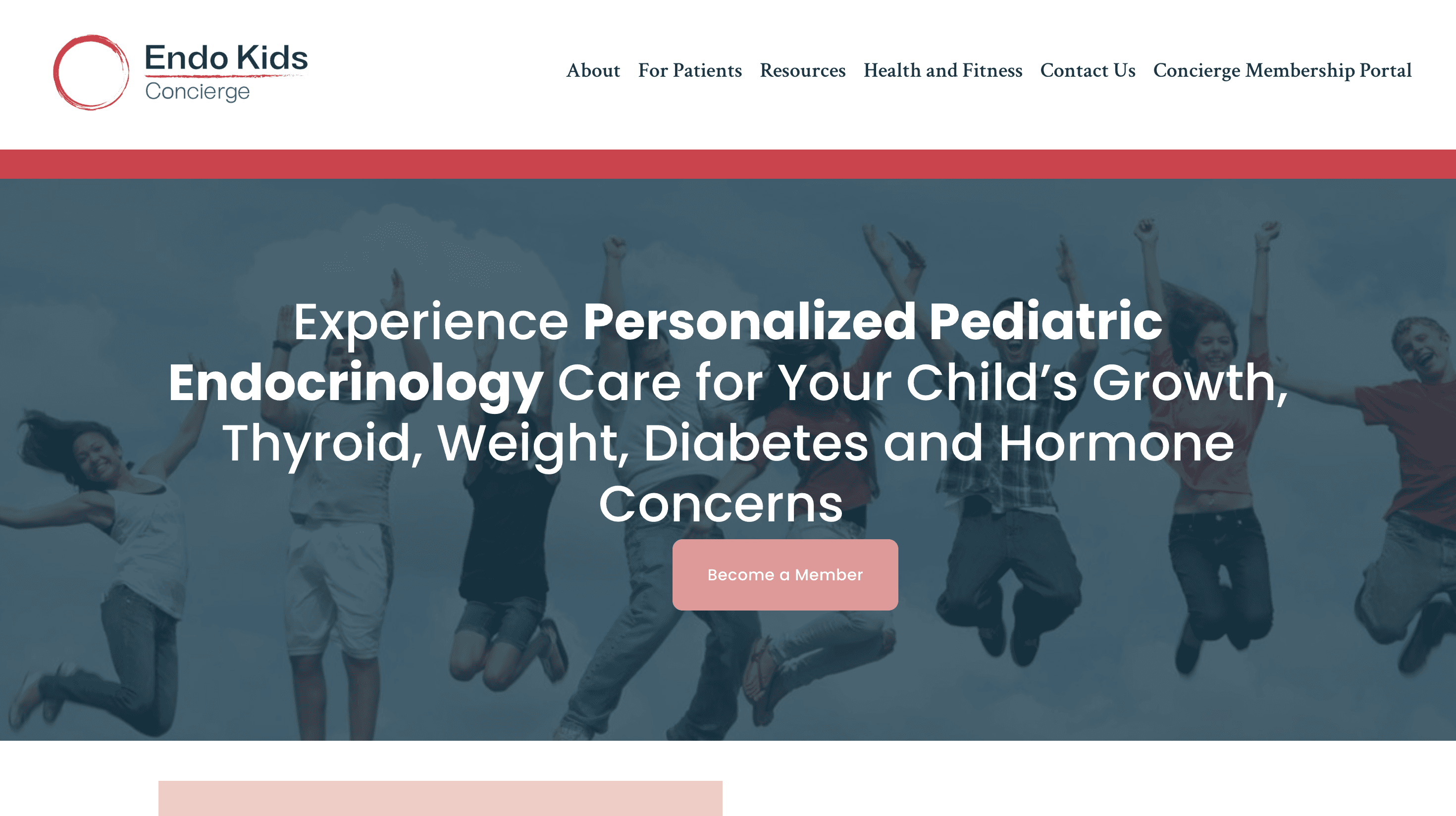 The Endokids Concierge website reflects a warm, child-centered approach, blending soft colors, gentle typography, and friendly visuals to create a comforting digital space for families seeking personalized pediatric support.